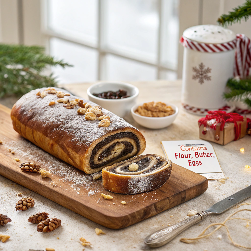 Karácsonyi bejgli dió nélkül: a hagyományos diós tölteléket pörkölt, ledarált napraforgómaggal helyettesítjük — ízében hasonló, de diót nem tartalmaz. Nem glutén-, nem tej- és nem tojásmentes recept (tartalmaz lisztet, vajat és tojást).